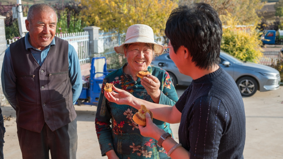 10月1日国庆节当天,在大石砬村委会,村民们依次从工作队和村干部手中接过象征“平安”的苹果和寓意“团圆”的月饼,院内洋溢着节日的欢乐氛围。