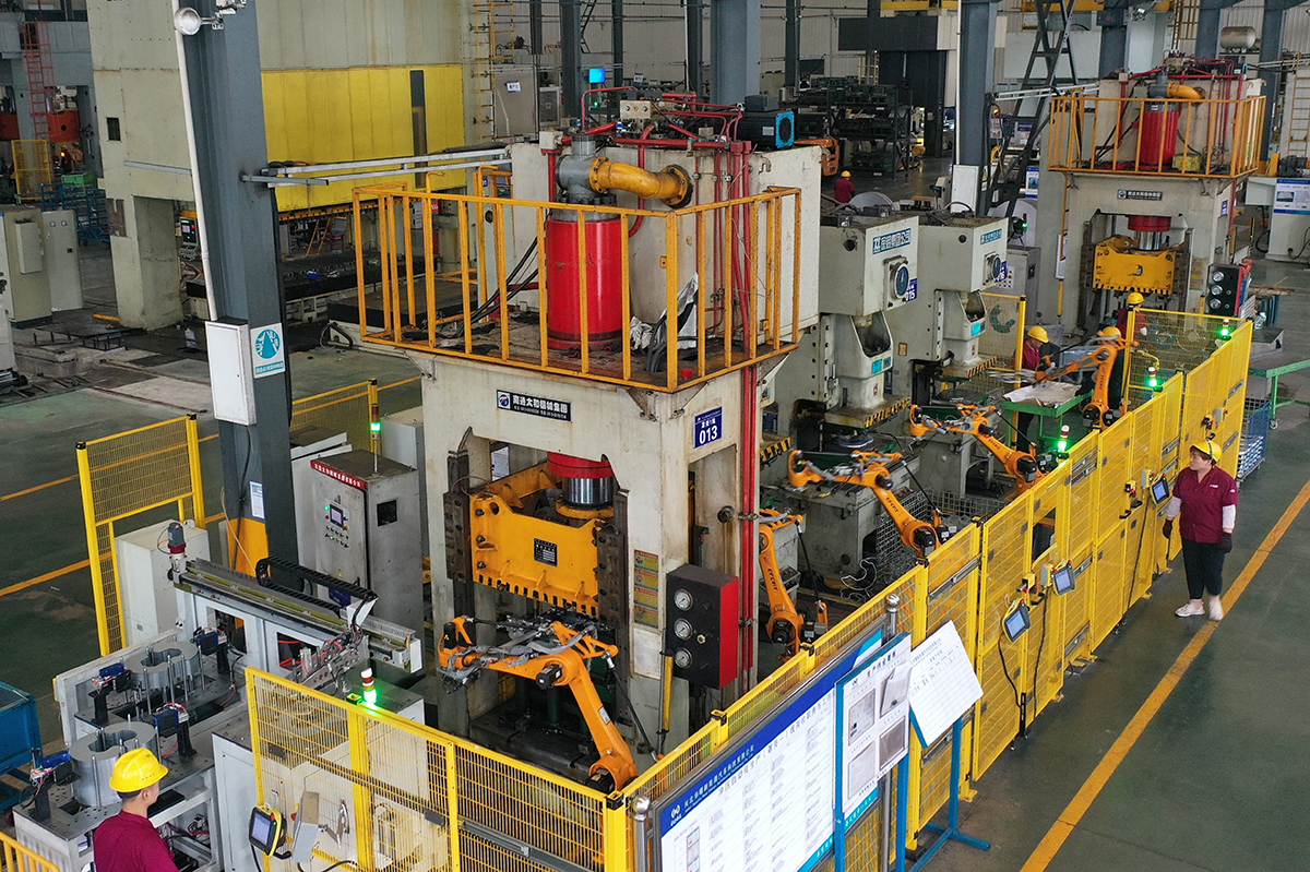 在河北新河经济开发区一家新能源汽车零部件加工企业车间内,工人在冲压自动化生产线上工作。李世强 摄