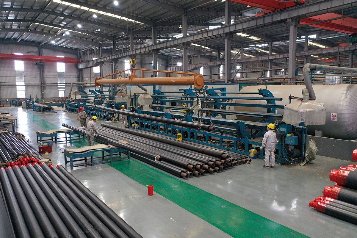 在河北新河经济开发区一家供热保温管制造企业车间内,工人在作业。李世强 摄