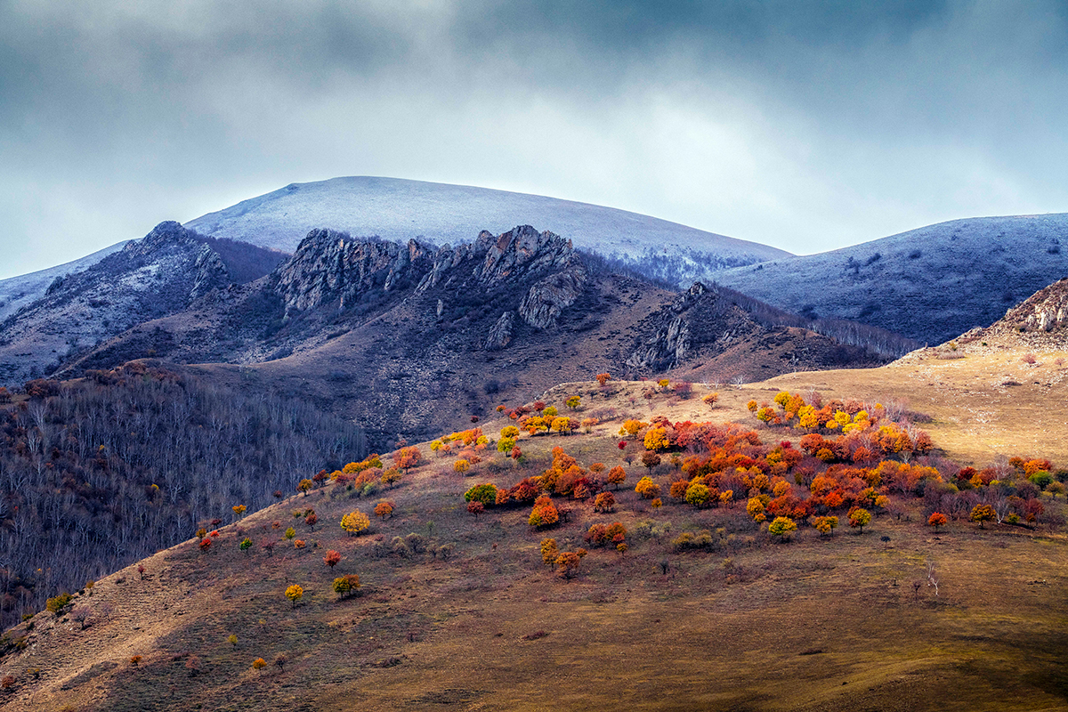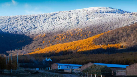 近日,河北省承德市丰宁满族自治县坝上地区迎来降雪。金黄秋叶与皑皑白雪在山坡上交相辉映,构成独特的秋日画卷。