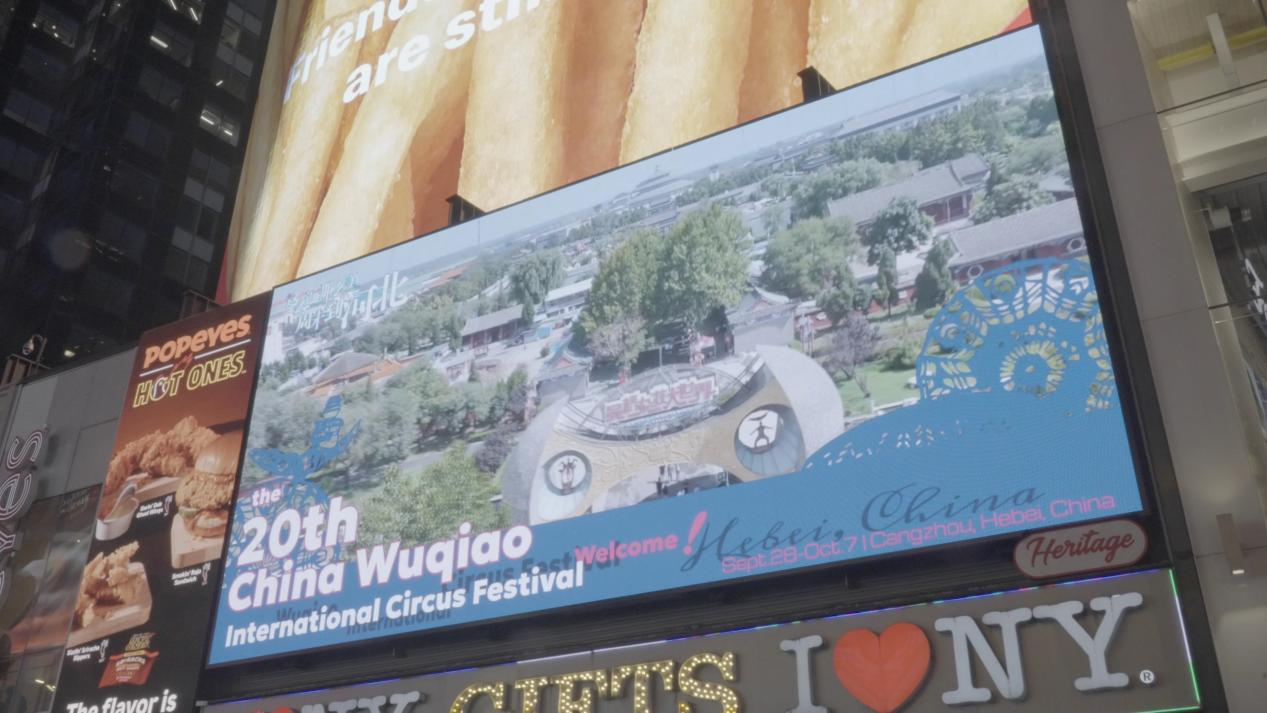 河北沧州吴桥杂技大世界亮相纽约时代广场大屏。