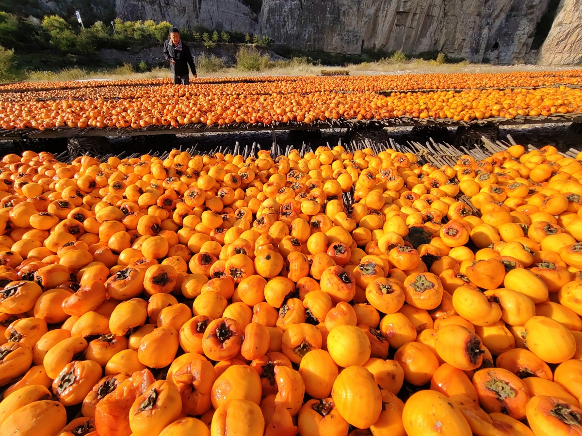 金黄的柿子铺满晾晒架。