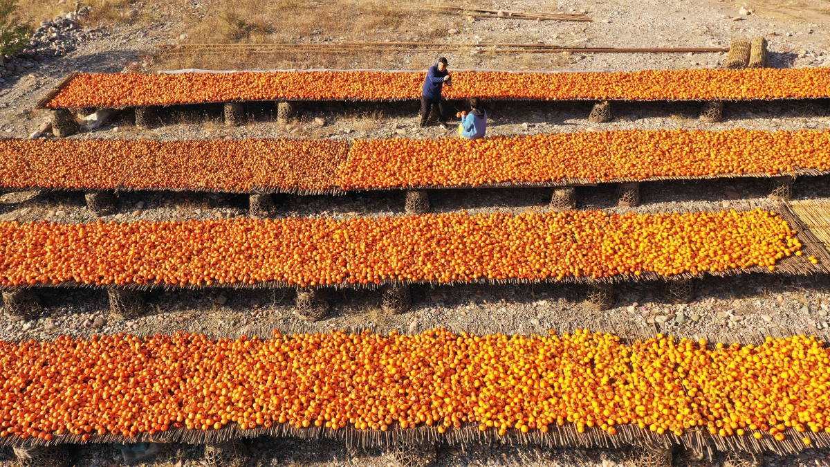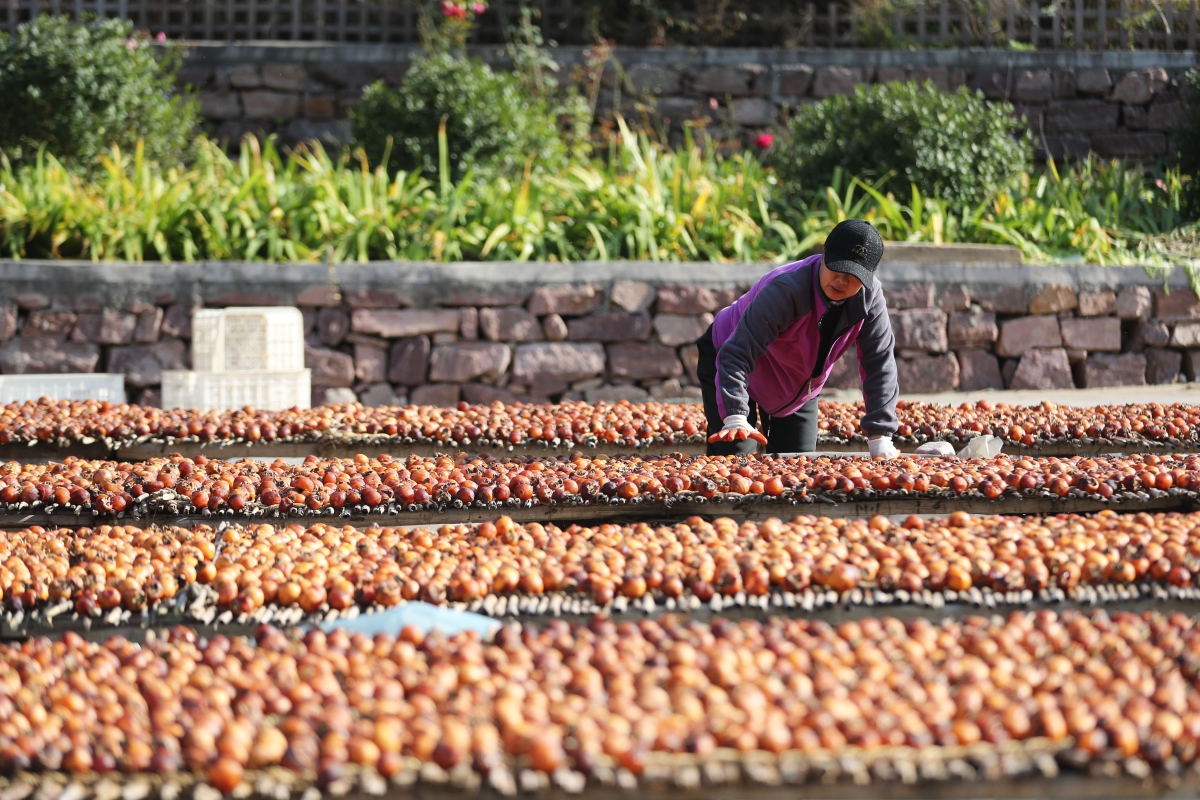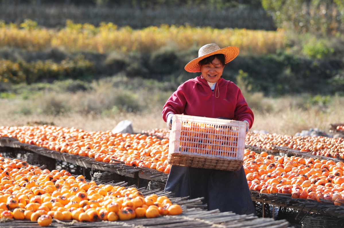 农户晾晒柿子。