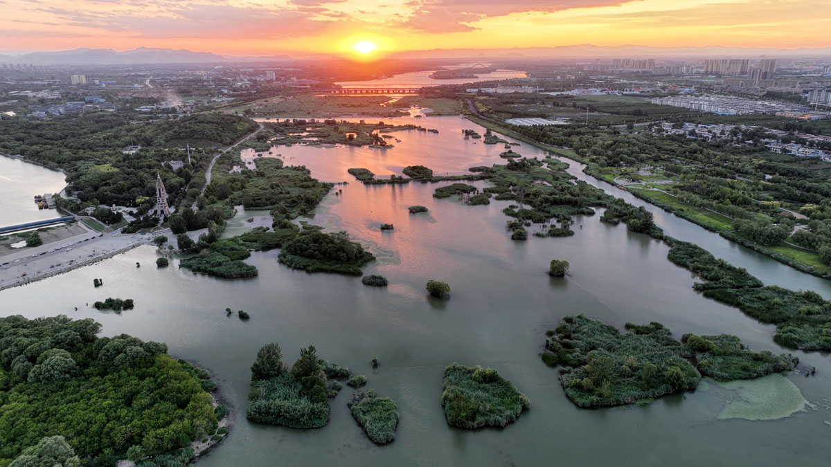 夕阳下的滹沱河石家庄段(2023年7月15日摄,无人机照片)。