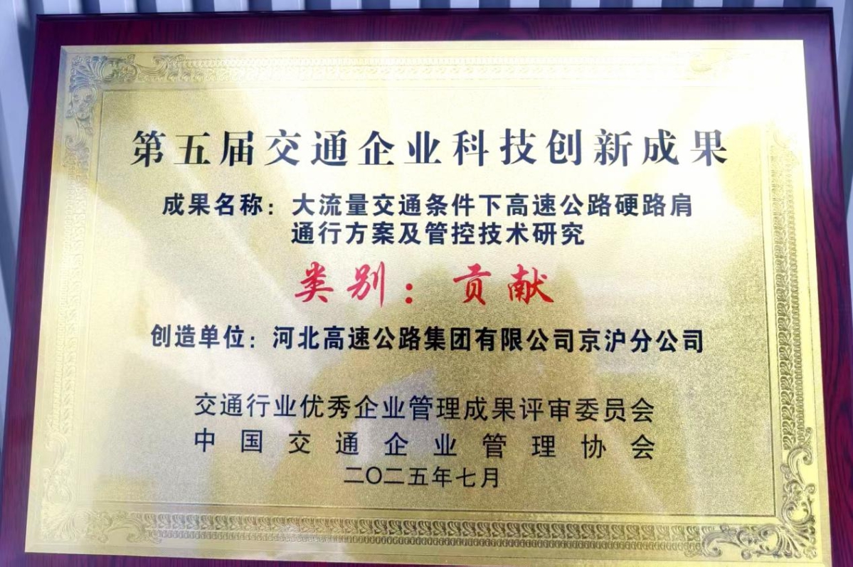 在事故多发及恶劣天气影响路段,1095套智能雾区诱导设施结合联动管控平台,根据能见度分级启动诱导模式,大幅降低雾区追尾事故率、缩短响应时间,有效避免了因事故导致的长时间交通堵塞,进一步减少了车辆停滞排放,从优化交通流的角度推动了节能降碳工作落地。2023年12月,“大流量交通条件下高速公路硬路肩通行方案及管控技术”获得河北高速集团特殊贡献奖三等奖;2025年7月,该项研究成果又获评“第五届交通企业科技创新贡献成果”。