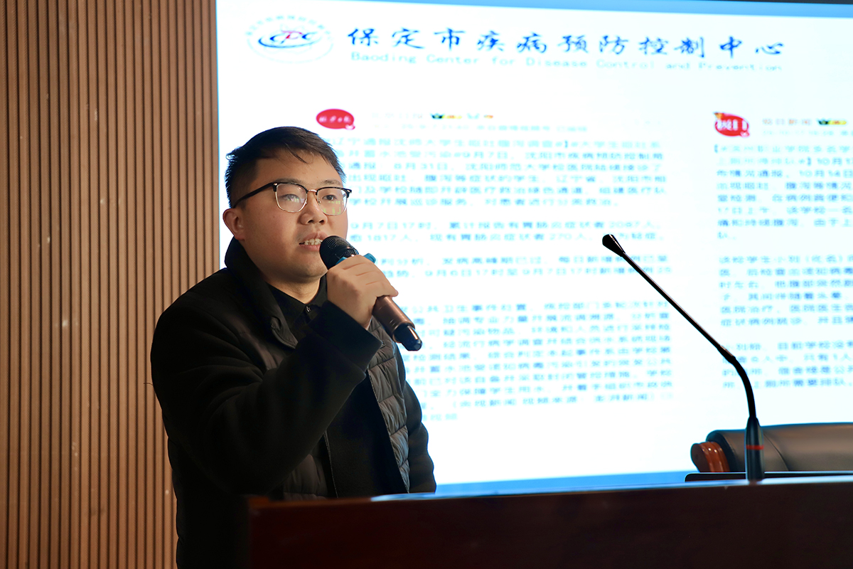 保定市疾病预防控制中心急性传染病防制科姚萌围绕冬春季节高发的传染病,着重讲解了诺如病毒感染、流行性感冒等疾病的防控知识。他提醒师生注意个人卫生和环境消毒,同时保持室内勤通风、减少聚集,出现高热、乏力等症状时及时就医。