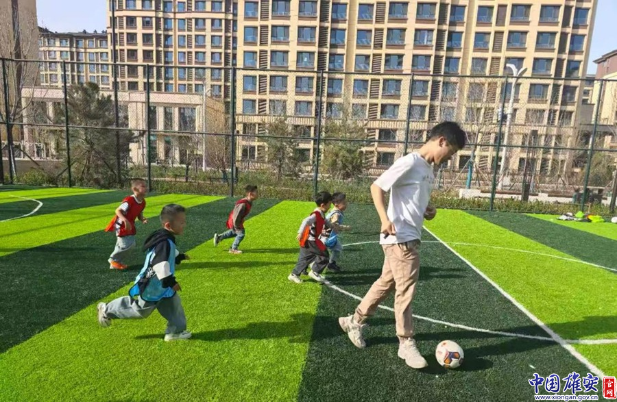 雄安雄东长宁幼儿园的孩子们在老师的带领下进行足球训练。中国雄安官网发