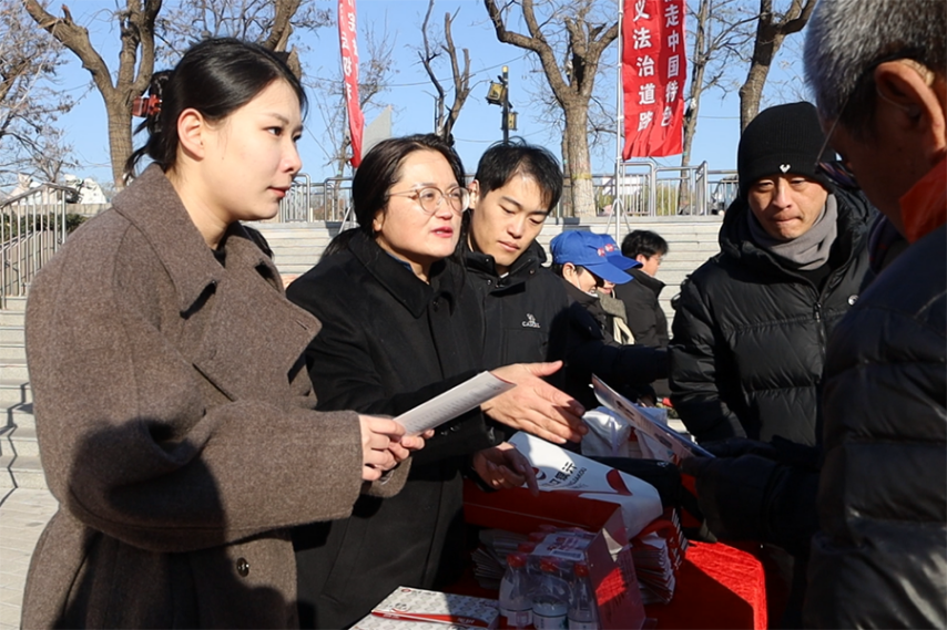 工作人员向市民发放普法宣传资料。刘冲 摄