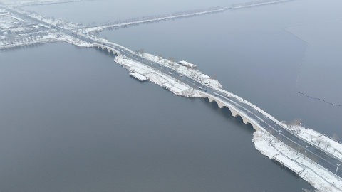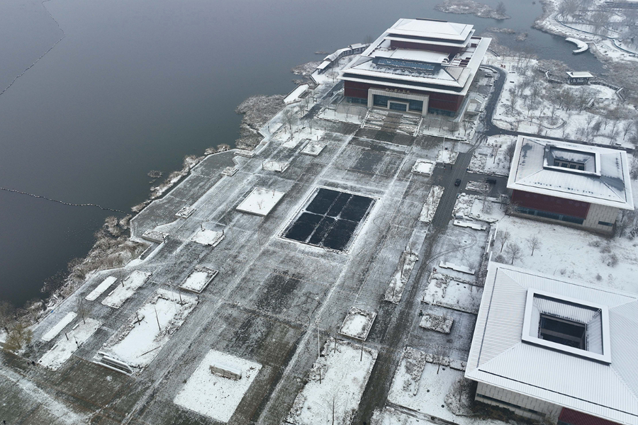 12月13日,河北邢台南宫市南宫湖公园雪后初晴。湖水与树木、楼宇相映成趣,勾勒出一幅静谧的冬日生态画卷。