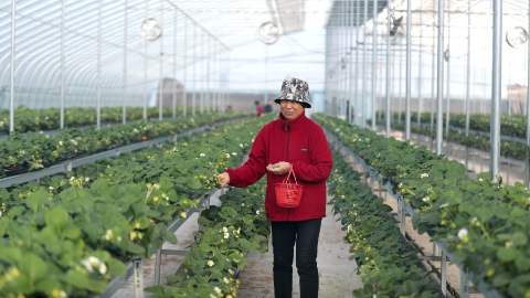 石家庄市井陉县小作村智能温室大棚里,村民在采摘草莓。