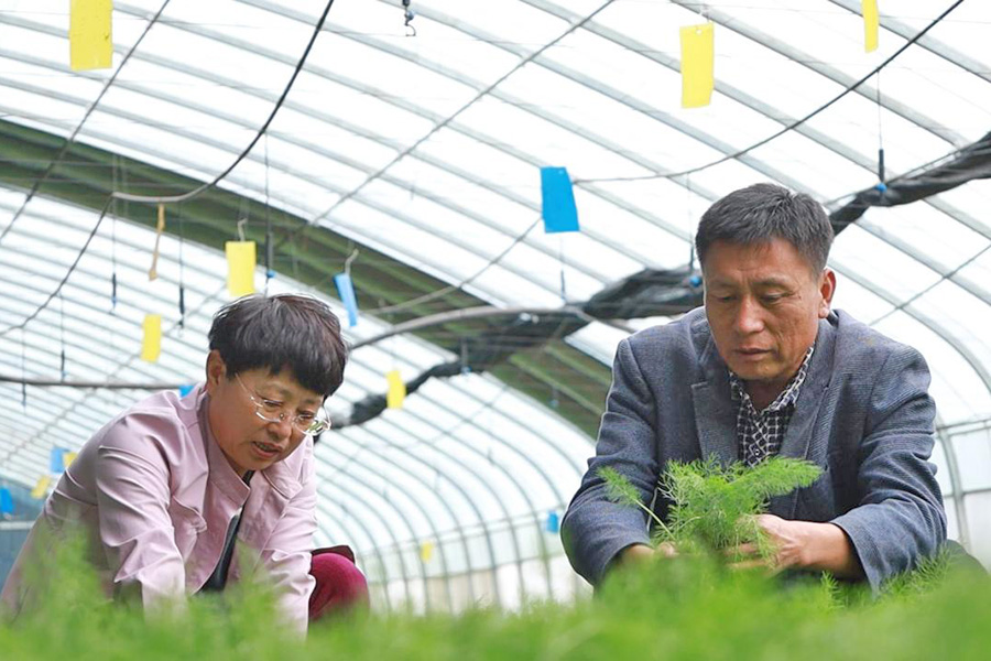 农技人员查看大棚内茴香生长情况。刘冲 摄