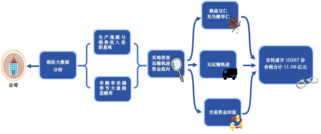 检查人员随即调取了8户企业的税费申报数据和进销项发票的开具情况,进一步了解企业的生产经营模式。经核实,8户企业均是购进酸枣去除果肉进行破壳,产出酸枣仁后对外销售。但上述8户企业只有对外销售酸枣仁时才突击采购酸枣,甚至在1-2月非酸枣采摘季节大量购进酸枣,农产品收购票清一色“顶额连号”,这明显不合理。
