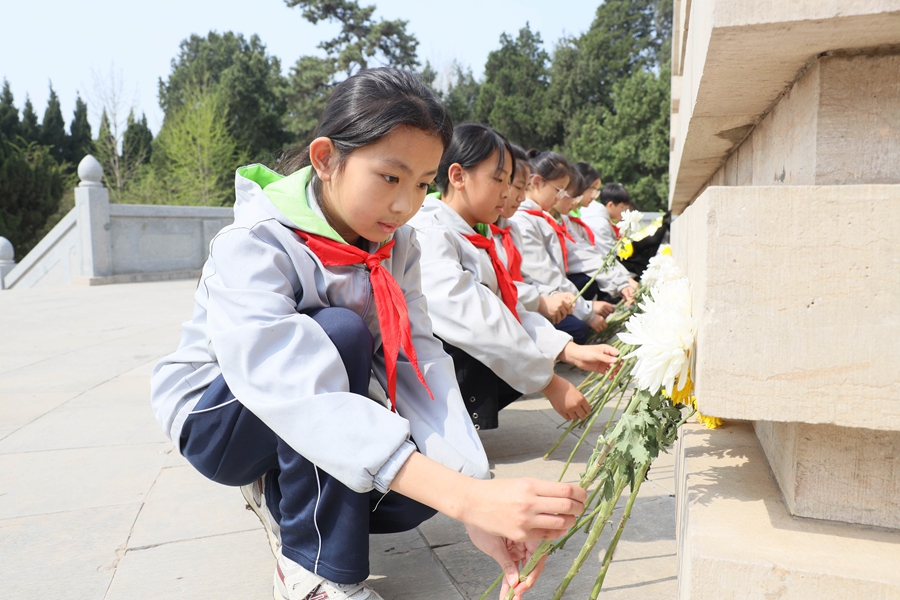 南宫市第二小学学生向革命烈士纪念碑敬献鲜花。田优 摄