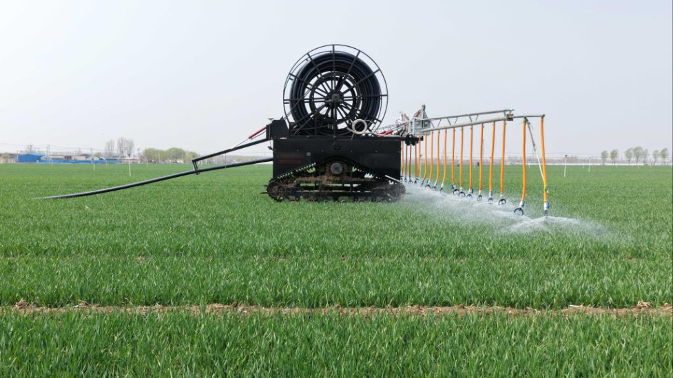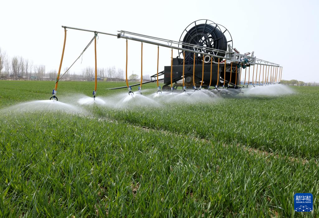 4月2日,自走式水肥一体农田喷灌设备在河北省唐山市丰南区大新庄镇的冬小麦田间进行喷灌作业。