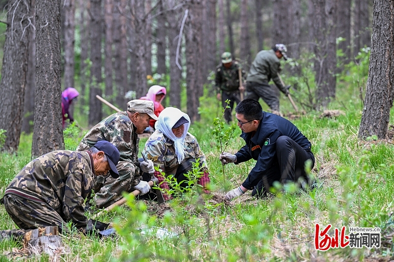 2024年5月23日,塞罕坝机械林场技术员唐超(前排右一)在指导附近村民栽植树苗。(河北日报资料片)河北日报记者田明 摄