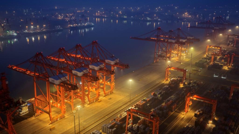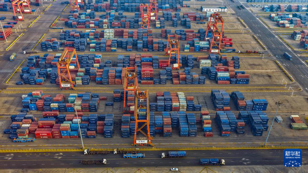 4月17日,车辆在河北省唐山港京唐港区集装箱码头堆场拉运集装箱(无人机照片)。