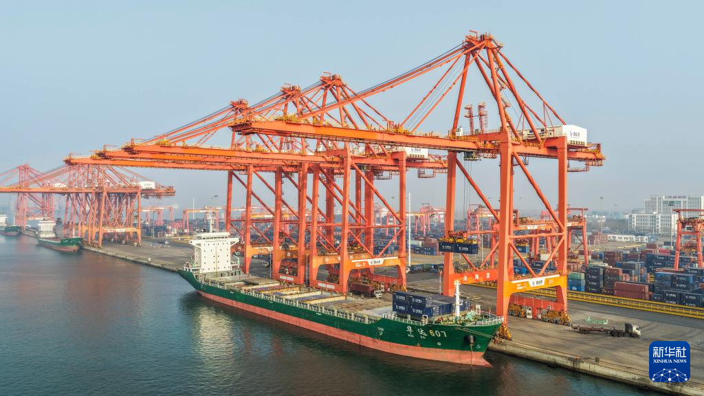 4月18日拍摄的唐山港京唐港区集装箱码头景色(无人机照片)。