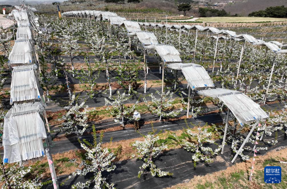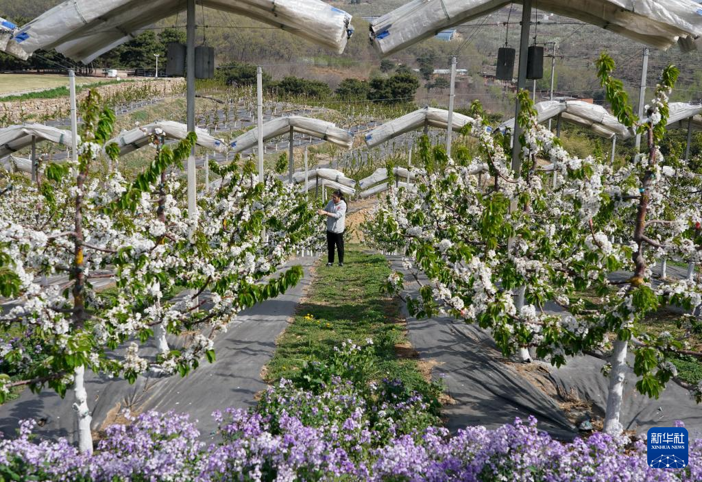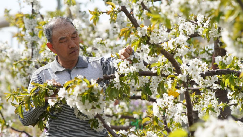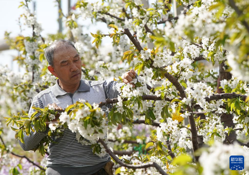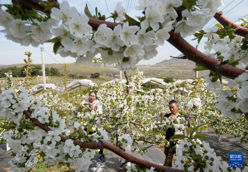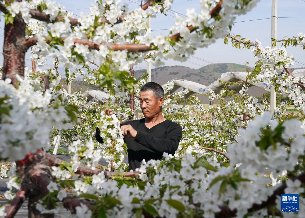 近日,河北省秦皇岛市山海关区的3万多亩樱桃树陆续开花,果农抢抓农时进行疏花授粉。